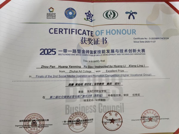近日,2025“一带一路”暨金砖国家技能发展与技术创新大赛—第二届社交媒体运营与推广大赛全国选拔赛及总决赛圆满落幕。我校数字经济与技术(产业)学院23市营周攀、黄焰明,24跨境傅思域、吴殷凯,24电商黄俊皓,24计算机叶桦桦、23跨境彭溢铭、24网营方朝霞、24网营林丽芳等9名学子,在龙的娴、黄莉、项玲三位老师指导下,凭借扎实的专业功底、创新的运营思维和默契的团队协作,从全国600余支参赛队伍中脱颖而出,一举斩获全国选拔赛二等奖1项、三等奖1项、优秀奖1项,3名学子晋级全国总决赛并斩获优秀奖,充分展现了我校高职教育在数字媒体领域的教学成果与学子的良好精神风貌。