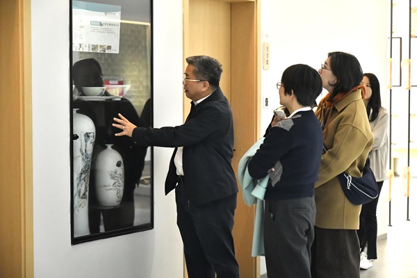 在文创中心,梁婷校长一行近距离欣赏了陶瓷设计与工艺专业师生的优秀作品,并对中心的建设与运营给予了高度评价。叶深南校长简要介绍了艺术设计学院的办学历史、专业特色等,重点介绍了中国工艺美术学会与珠海艺术职业学院共建的高温色釉研学基地,该基地已培养出1名广东省工艺美术大师、多名省级技能竞赛获奖者,以及成功立项国家艺术基金项目的成果等。