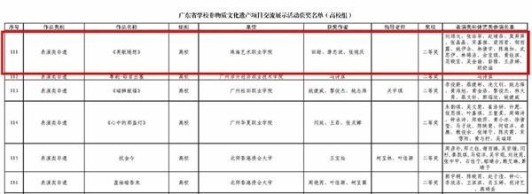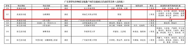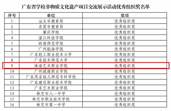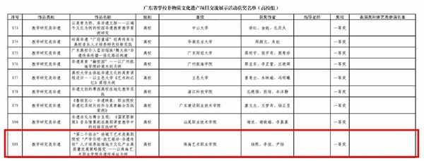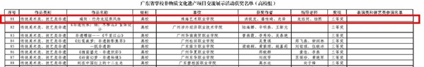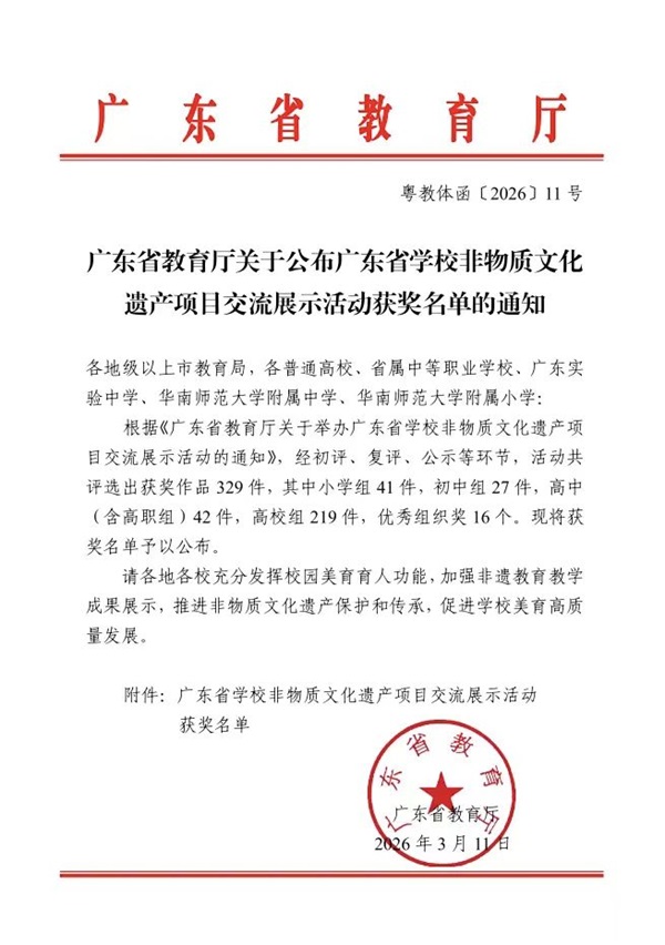 近日,广东省教育厅正式印发全省学校非物质文化遗产项目交流展示活动获奖名单(粤教体函〔2026〕11号)。我校在全省各级院校的激烈角逐中脱颖而出,报送的4项参赛作品悉数获奖,斩获一等奖1项、二等奖1项、三等奖2项,并获评优秀组织奖,共摘得5项省级荣誉,充分彰显了我校非遗传承与美育教育深度融合的优质成果。