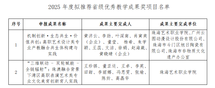 根据《关于开展全省学校优秀教学成果奖评审工作的通知》(粤教人函〔2025〕23号)文件精神,学校组织开展了2025年全省学校优秀教学成果奖(职业教育)遴选推荐工作。经二级单位申报、教务处审核、校内外专家评审等程序,遴选出2项成果申报2025年全省学校优秀教学成果奖(职业教育),现将拟推荐成果名单予以公示,详见附件。